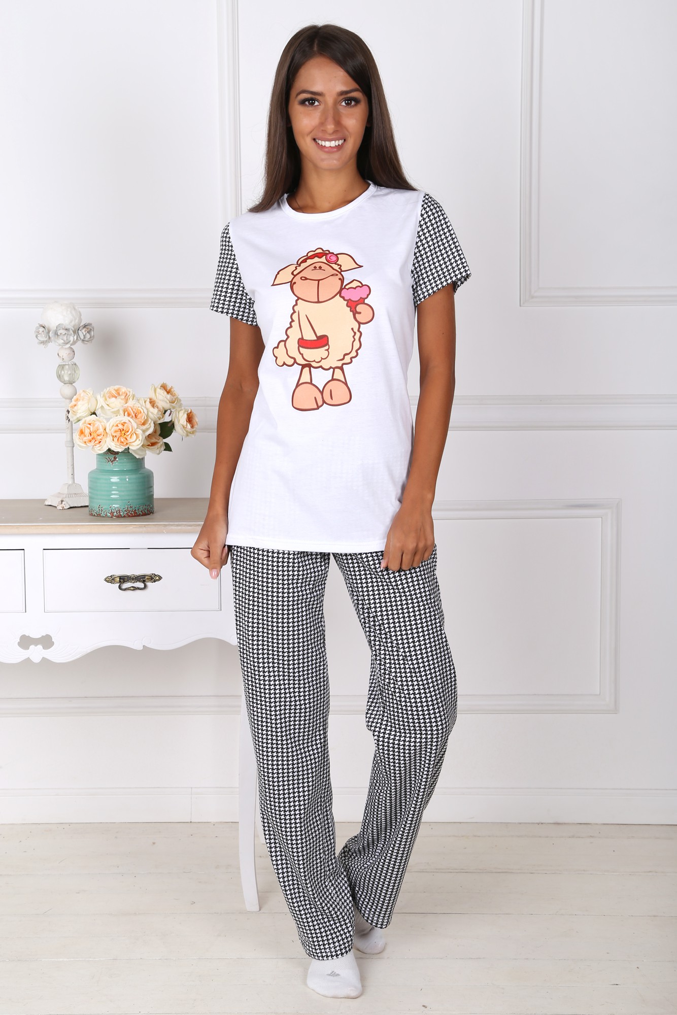 Замечательный домашний костюм – сделает уют по настоящему домашним, а ваш отдых полноценным Состоит из футболки свободного покроя и брюк на эластичном поясе длинна футболки по спинке 68см, длинна рукава 18 см. длинна брюк по внутреннему шву 78 см.