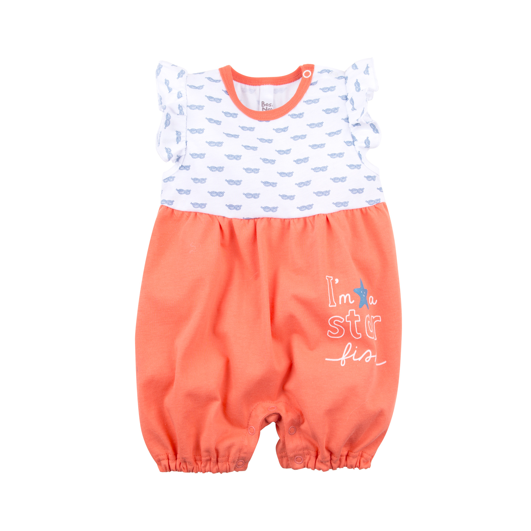 Полотно: 161 - Супрем однотонный, 100% хлопок Описание: Песочник для девочки отрезной по талии. Горловина и проймы обработаны бейкой. Застежка на кнопки на плече и под памперс.Рукава "крылышки". Низ ножек на резинке. Сбоку принт.