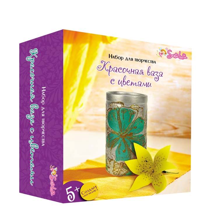 Состав: ваза керамическая - 1 шт., акриловые краски - 2 шт., контур - 1 шт., кисточка - 1 шт., клей - 1 шт., цветная бумага - 2 вида, проволка-1шт., инструкция-1шт.